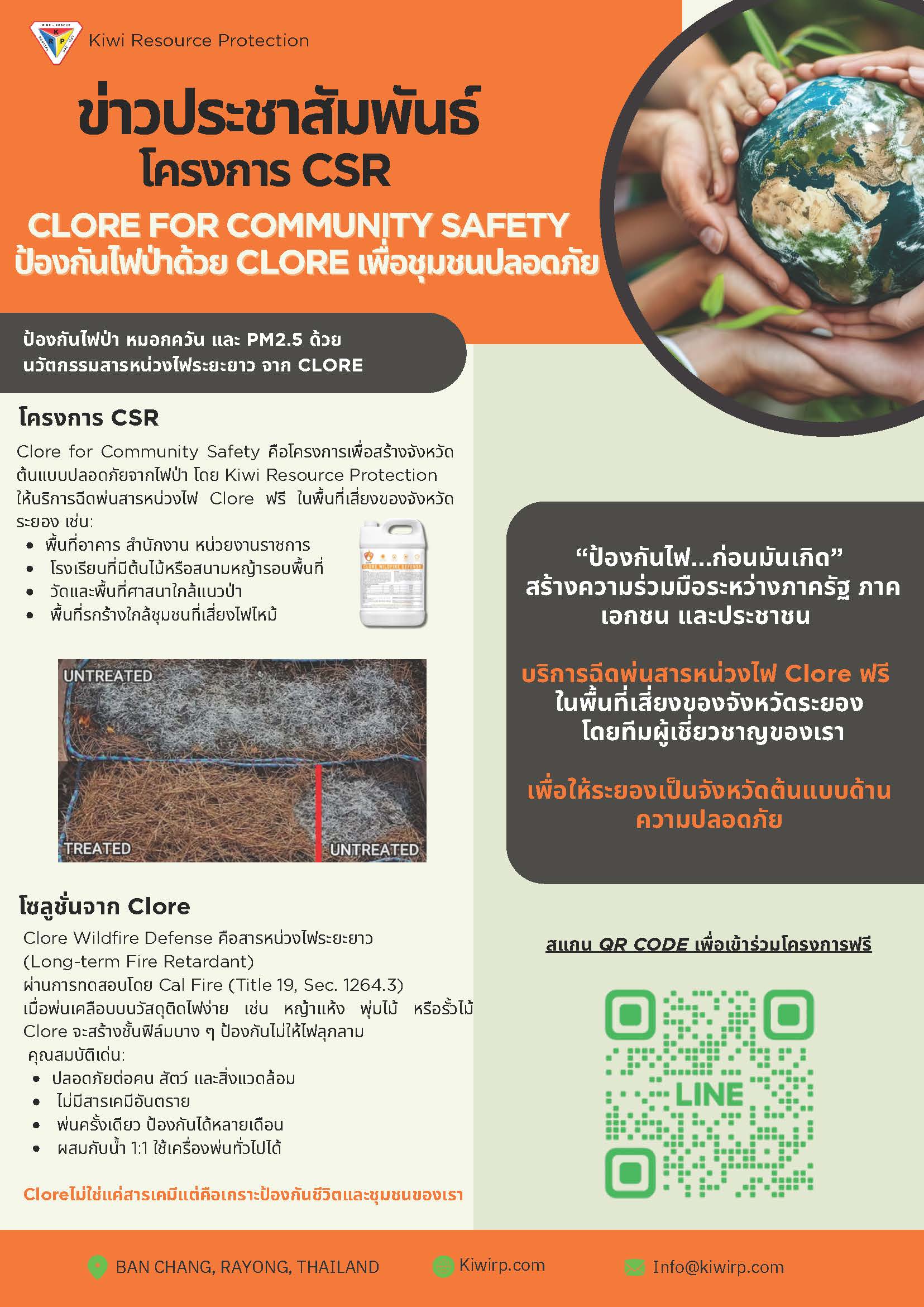 ภายในงาน ทีม KIWI ได้นำเสนอ Clore Wildfire Defense นวัตกรรมสารหน่วงไฟระยะยาวเพื่อการป้องกันไฟป่าอย่างยั่งยืน พร้อมแนะนำ โครงการ Clore for Community Safety (CSR) ที่มุ่งผลักดันให้ “ระยอง” เป็นต้นแบบของจังหวัดปลอดภัย ด้วยความร่วมมือจากภาครัฐ เอกชน และประชาชน