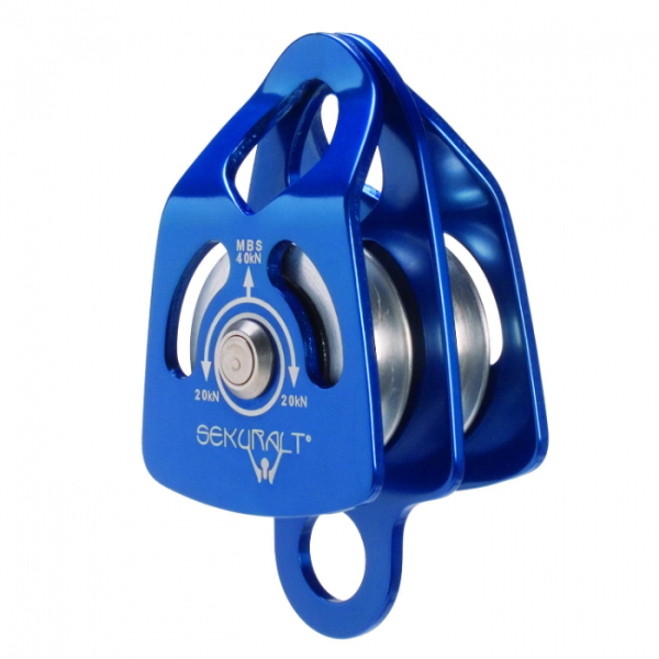 Oversized double pulley, for ropes of up to 16 mm, with brass bushing and auxiliary anchorage in the lower area.