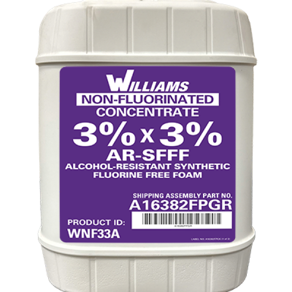 WILLIAMS WNF33A Foam Concentrate delivers exceptional firefighting performance, continuing the renowned heritage of Williams Fire & Hazard Control foams. WNF33A is a 3%x3% Alcohol Resistant Non-Fluorinated Foam Concentrate that provides excellent fire and vapor suppression for Class B, polar solvent and hydrocarbon fuel fires. This synthetic foam concentrate is intended for forceful or gentle firefighting applications at 3% solution on hydrocarbon fuels and for gentle firefighting applications at 3% solution on polar solvent fuels.