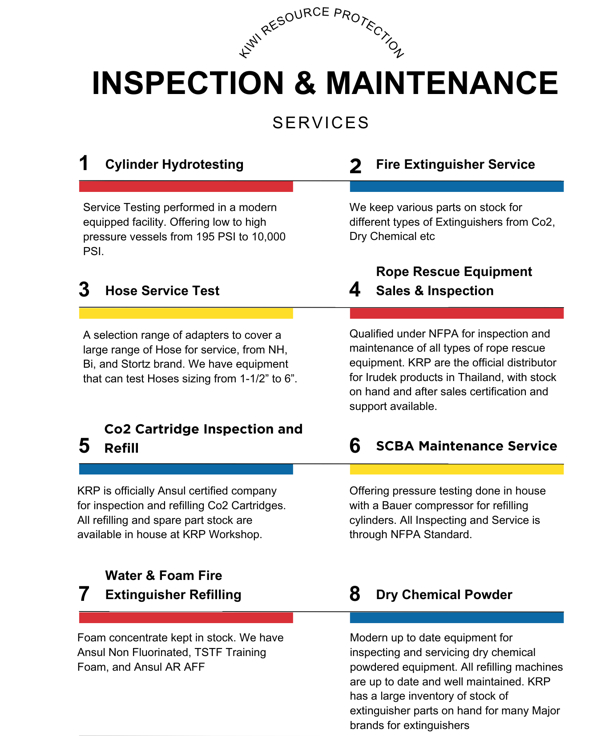 As well as sourcing equipment, our KRP Inspection & Maintenance Workshop operates daily and has stock of common spare parts for major brands. Our technicians are trained to NFPA and NZQA qualifications and undertake specialist training by various manufacturing companies. Our services are delivered in accordance with guidelines such as NFPA, AS/NZS, CGA, ISO, TIS, and British Standards. We offer our services both on site and at our workshop here in Thailand.